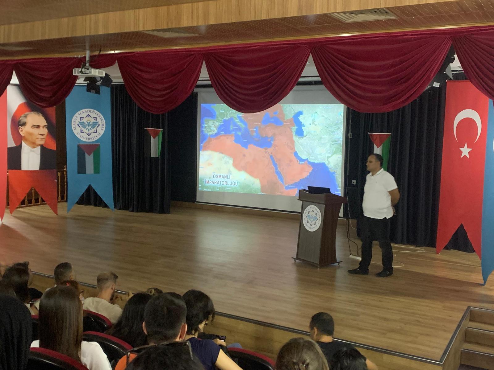 İsrail'in iki yıla yakın bir süreden beri Gazze'de, çoğunluğunu bebeklerin, kadınların, hasta ve yaşlıların oluşturduğu sivil halkı hedef alarak, hiçbir hukuki, ahlaki ve vicdani sınır tanımaksızın gerçekleştirdiği vahşi katliam, insanlık tarihine kara bir leke olarak geçmiştir. Alenen ve pervasızca sürdürülen bu vahşete bir an önce son verilmesi yegâne temennimiz olup bu soykırımı duyurmak insani ve vicdani görevimizdir. Bu amaçla 2025-2026 eğitim-öğretim yılının başında Meslek Yüksekokulumuzda kayıtlı tüm öğrencilerimize ve personellerimize Meslek Yüksekokul Müdürümüz Prof. Dr. Özgür GÖLGE tarafından Konferans Salonumuzda "İlk ders Filistin" konulu bir sunum gerçekleştirmiştir.