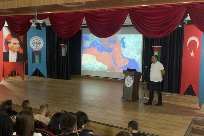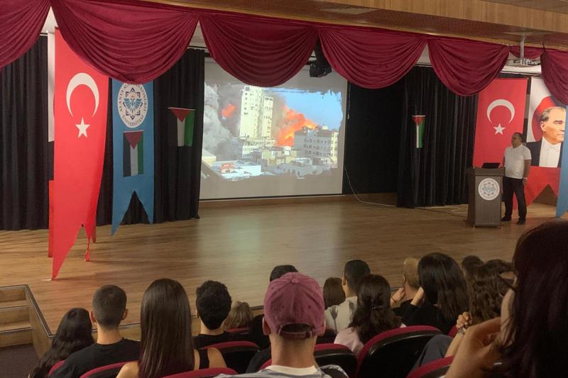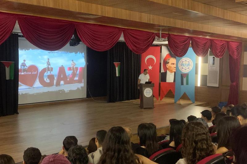 İsrail'in iki yıla yakın bir süreden beri Gazze'de, çoğunluğunu bebeklerin, kadınların, hasta ve yaşlıların oluşturduğu sivil halkı hedef alarak, hiçbir hukuki, ahlaki ve vicdani sınır tanımaksızın gerçekleştirdiği vahşi katliam, insanlık tarihine kara bir leke olarak geçmiştir. Alenen ve pervasızca sürdürülen bu vahşete bir an önce son verilmesi yegâne temennimiz olup bu soykırımı duyurmak insani ve vicdani görevimizdir. Bu amaçla 2025-2026 eğitim-öğretim yılının başında Meslek Yüksekokulumuzda kayıtlı tüm öğrencilerimize ve personellerimize Meslek Yüksekokul Müdürümüz Prof. Dr. Özgür GÖLGE tarafından Konferans Salonumuzda "İlk ders Filistin" konulu bir sunum gerçekleştirmiştir.