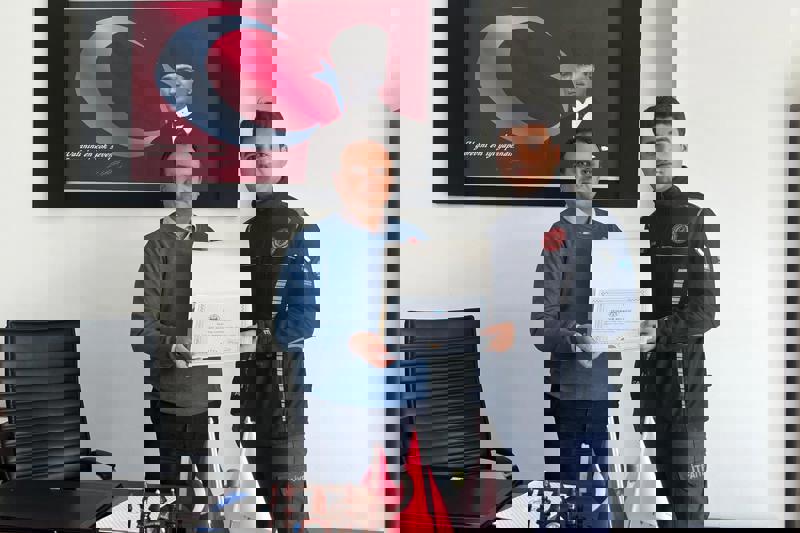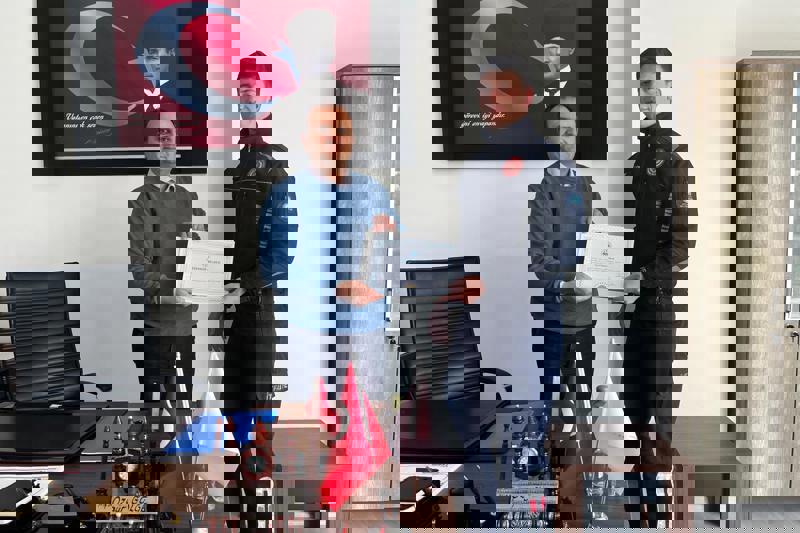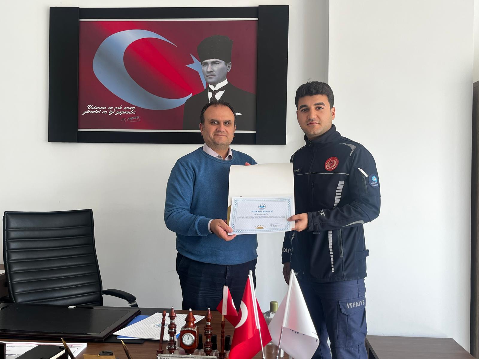 Verimli geçen eğitimin ardından Yüksekokul Müdürümüz Sayın Prof. Dr. Özgür GÖLGE tarafından itfaiye personelleri Ömer Safsöz ve Tahsin Çorak’a teşekkür belgeleri verilmiştir.