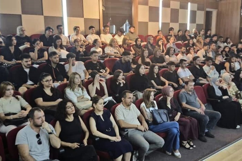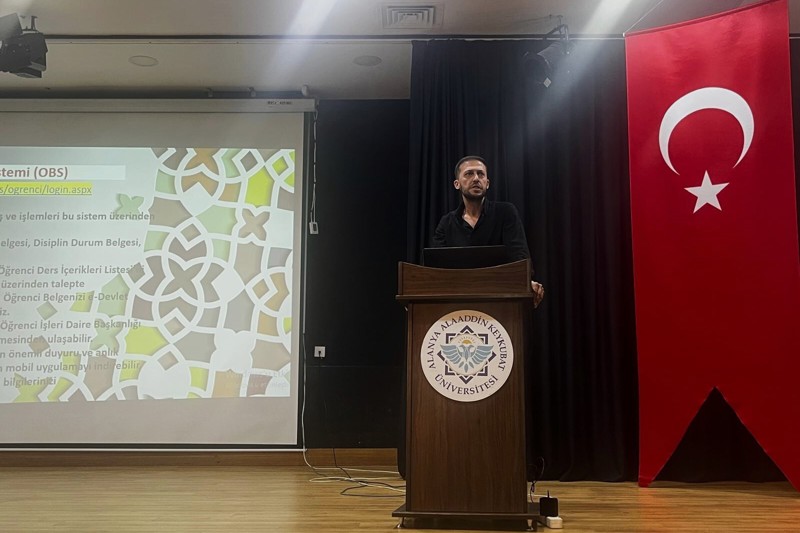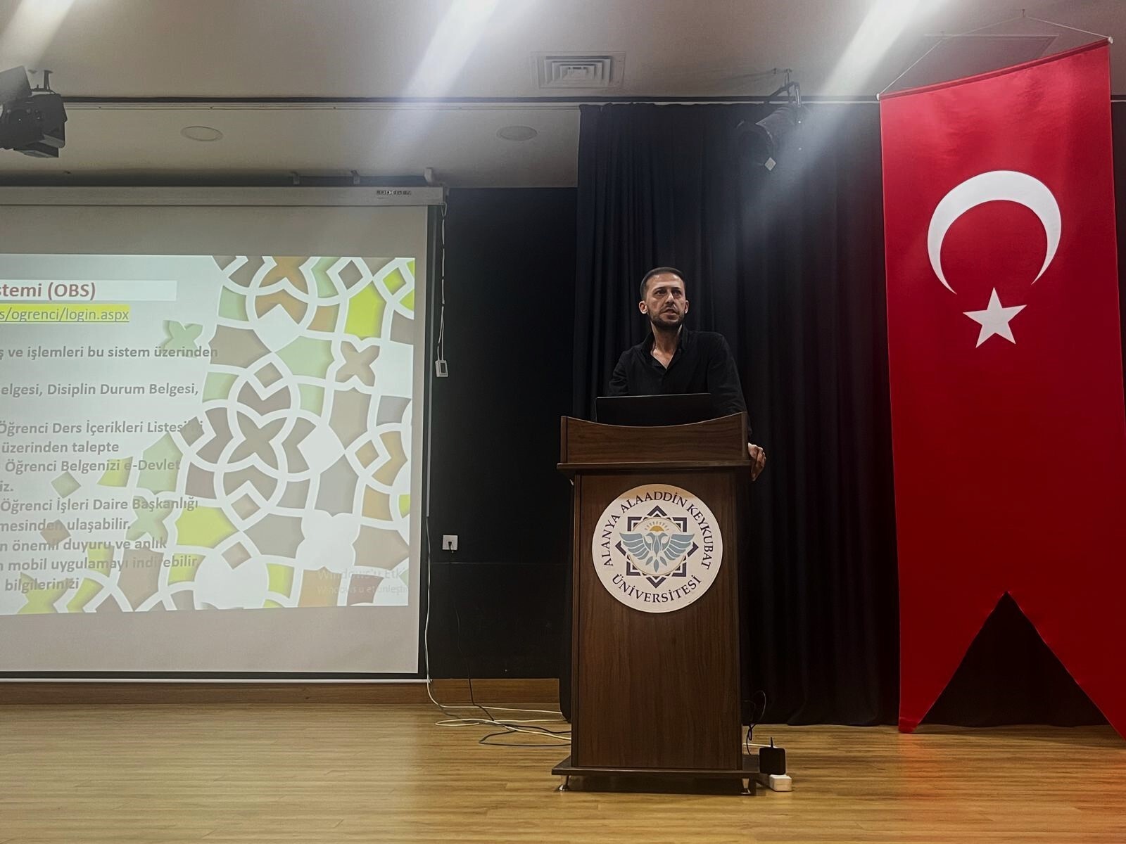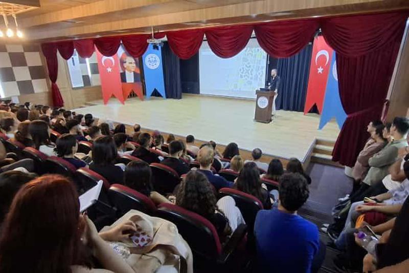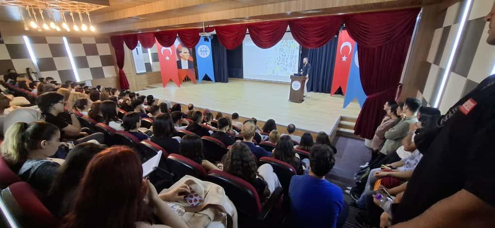 Oryantasyon eğitiminde öğrencilerimize, üniversitede yaşam, yurt, yemekhane, kütüphane, ulaşım, sportif faaliyetler, bölüm ve öğrenci işleri vb. konular hakkında detaylı bilgiler verdi.